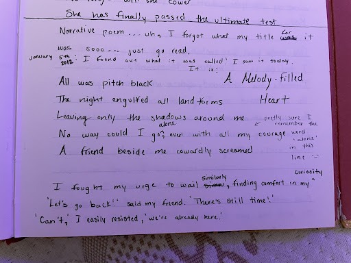 I frequented Barnes & Noble before, but when I bought my first poetry journal, I felt the rush of having something that was only mine. A golden book with red cherry blossoms, bound by a magnetic clasp. First, I copied down my first poems from my poetry book. Then I just started . . . writing.